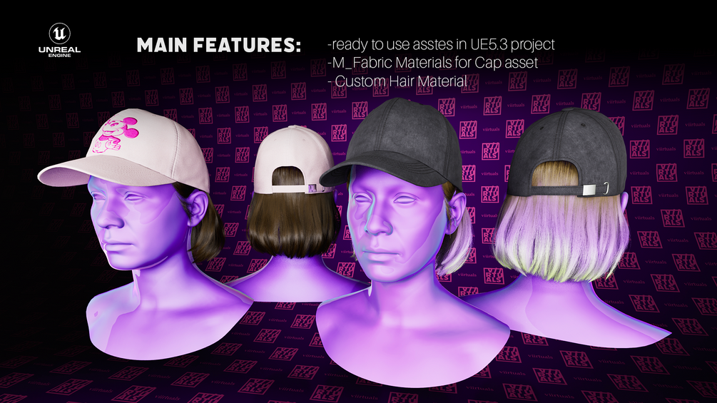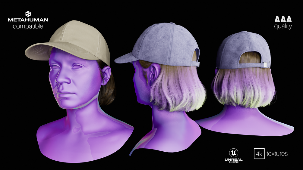 Ready to use in your cinematic/game in UE5 - a dadhat (baseball cap) asset with Female Bob Hair for Metahuman. Photorealistic quality, good topology and no UV stretching. Hair asset is optimized for the hat and is not intended for a standalone use - please check the wireframe screenshots.
