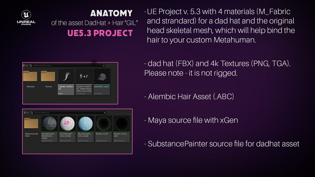 - UE Project v. 5.3 with 4 materials (M_Fabric and strandard) for a dad hat and the original head skeletal mesh, which will help bind the hair to your custom Metahuman.