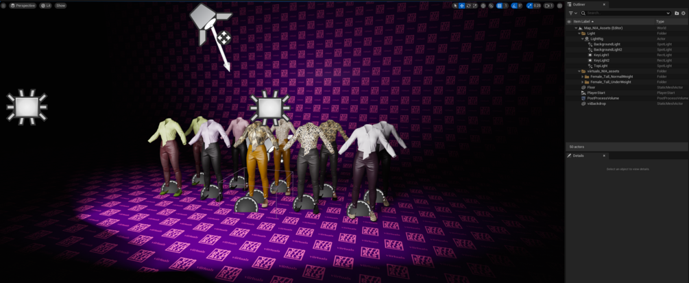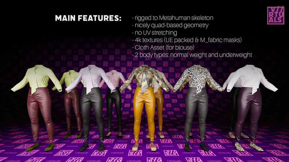 A realistic, AAA-quality 3D clothing asset pack featuring gamedev/animation-friendly topology. No UV stretching guarantees perfect texture alignment. Rigged to MetaHuman, these assets are ready to use straight out of the box. Fits only the Female Tall Normal Weight Metahuman body type and Tall Underweight.