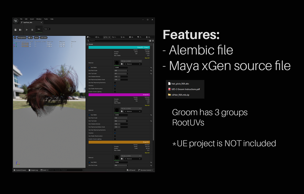 Alembic file (.ABC), Maya xGen source file, Short Guide of how to set everything in UE5 (PDF)